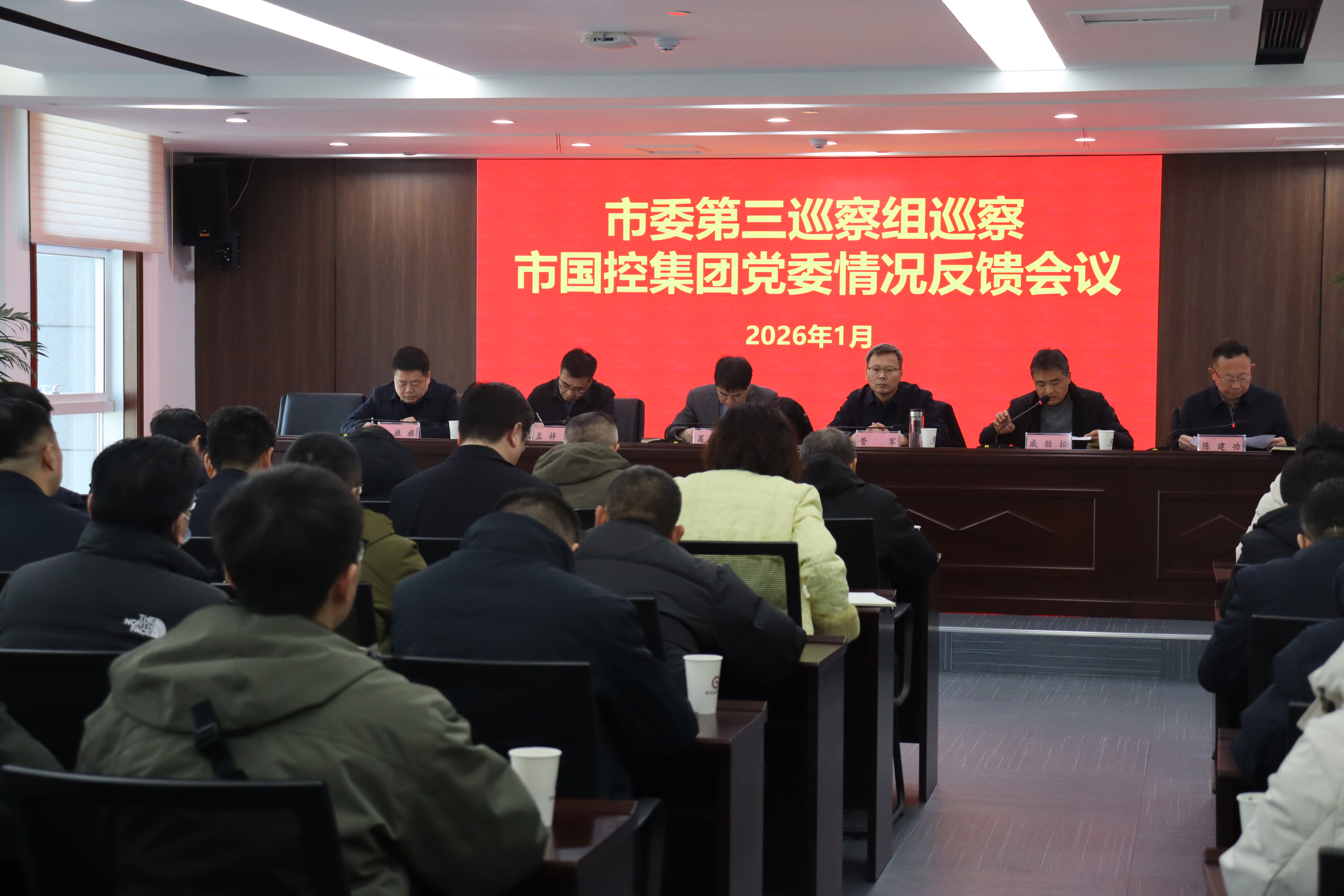 2026年1月12日上午,市委第三巡察組向市國控集團黨委反饋巡察情況。巡察組組長戚勁松代表市委巡察組向市國控集團黨委書記、董事長陳建功和市國控集團領(lǐng)導(dǎo)班子反饋巡察情況。市委常委、市政府常務(wù)副市長葛銳出席會議,傳達(dá)了市委書記專題會議精神,并就落實巡察反饋意見提出要求。陳建功主持會議并作表態(tài)發(fā)言。