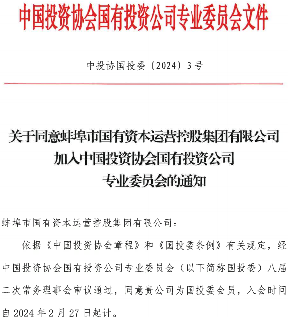 熱烈祝賀蚌埠國(guó)控集團(tuán)加入中國(guó)投資協(xié)會(huì)國(guó)有投資公司專業(yè)委員會(huì)