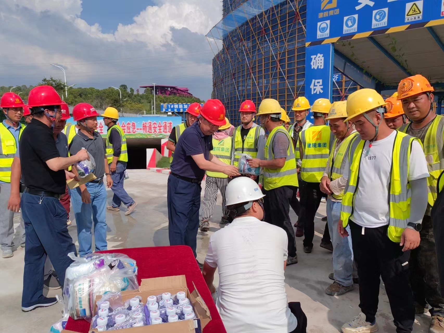 炎炎夏日送清涼,絲絲關(guān)懷暖人心。持續(xù)高溫悶熱天氣,給堅(jiān)守一線的職工帶來(lái)了嚴(yán)峻“烤”驗(yàn)。為切實(shí)做好抗高溫防暑降溫工作,有效防控高溫中暑事件和安全生產(chǎn)事故的發(fā)生,切實(shí)維護(hù)廣大職工的勞動(dòng)安全和健康權(quán)益,按照市國(guó)控集團(tuán)黨委、市國(guó)控集團(tuán)工會(huì)的統(tǒng)一部署,7月25日-7月26日,集團(tuán)黨委書(shū)記、董事長(zhǎng)陳建功,黨委副書(shū)記、副董事長(zhǎng)、總經(jīng)理劉冰,黨委委員、副總經(jīng)理翁暢等分別帶隊(duì)走訪慰問(wèn)了建筑科創(chuàng)中心項(xiàng)目部、新二中站點(diǎn)、幸福河湖項(xiàng)目部、馬城糧庫(kù),為堅(jiān)守在一線的項(xiàng)目員工送上毛巾、香皂、清涼油等慰問(wèn)品,對(duì)大家的辛苦付出表示感謝,對(duì)一線職工不畏高溫、堅(jiān)守崗位、拼搏奉獻(xiàn)的精神表示贊揚(yáng),同時(shí)叮囑大家要努力克服高溫天氣帶來(lái)的困難和挑戰(zhàn),注意防暑降溫,做好自身防護(hù),確保各項(xiàng)工作安全有序推進(jìn)。