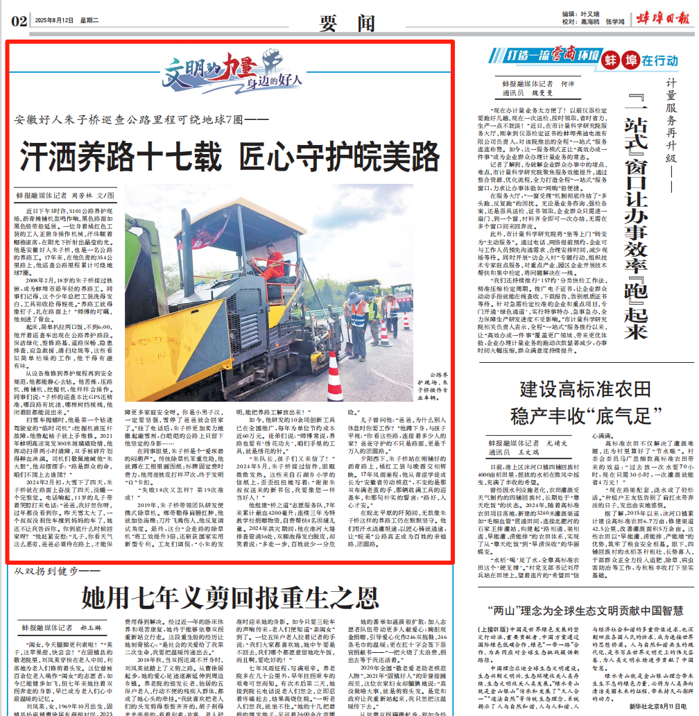 在皖北平原的阡陌間,無數(shù)像朱子橋這樣的養(yǎng)路工仍在默默堅守。他們用汗水澆灌坦途,以匠心鑄就通途,讓“皖美”公路真正成為百姓的幸福路、團圓路。